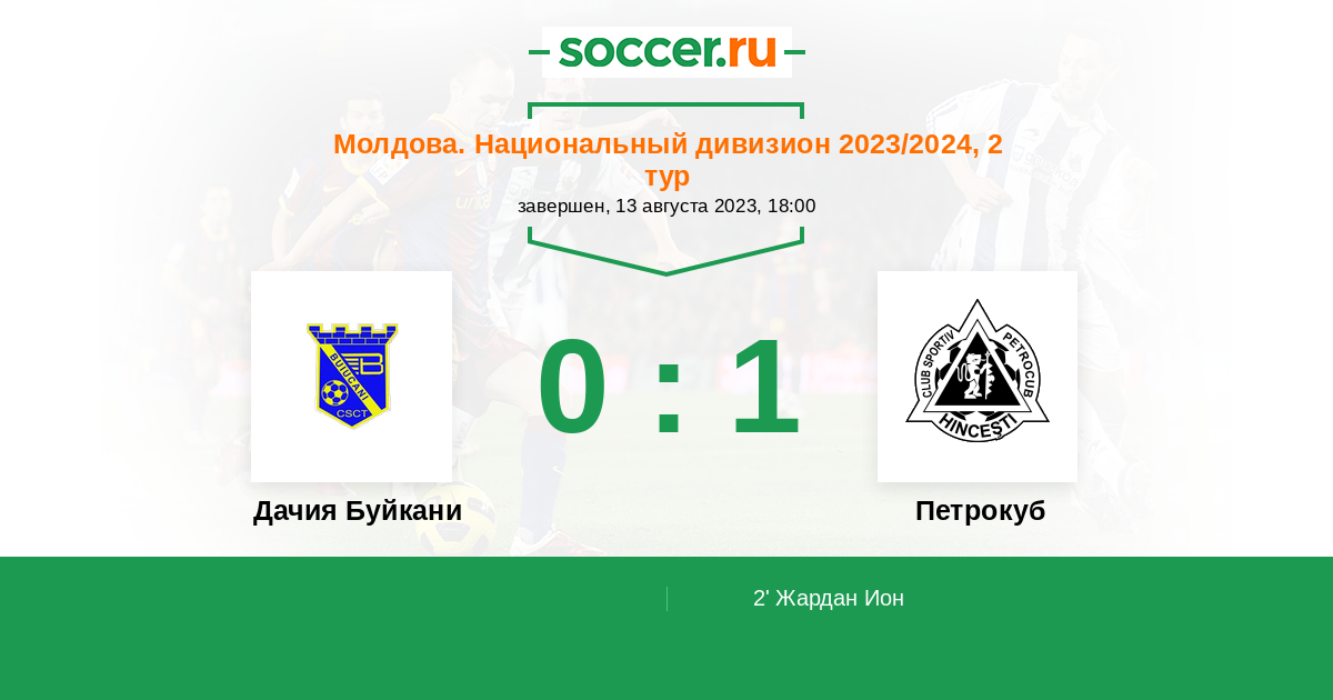 Молдова. Национальный дивизион 22.07.2020 Петрокуб Логотип футбольный клуб Петрокуб (Хынчешты) 2:0 Логотип футбольный клуб Дачия Буйкани (Кишинев) Дачия Буйкани
