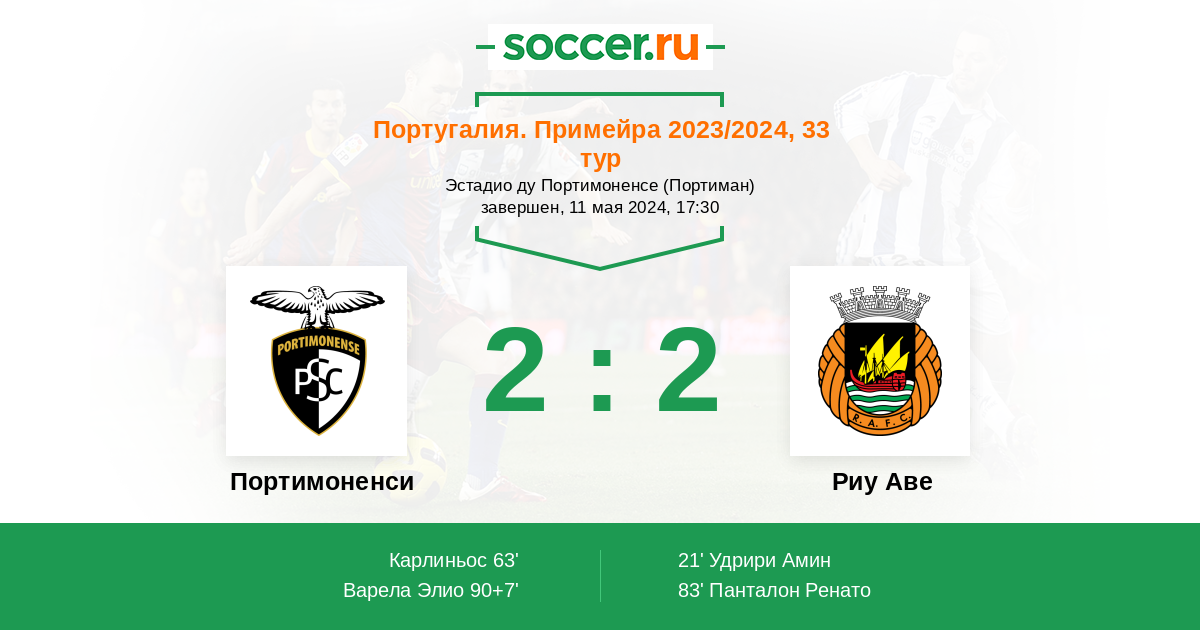 Португалия. Примейра 08.04.2023 Портимоненси Логотип футбольный клуб Портимоненси (Портиман) 2:2 Логотип футбольный клуб Риу Аве (Вила-ду-Конди) Риу Аве