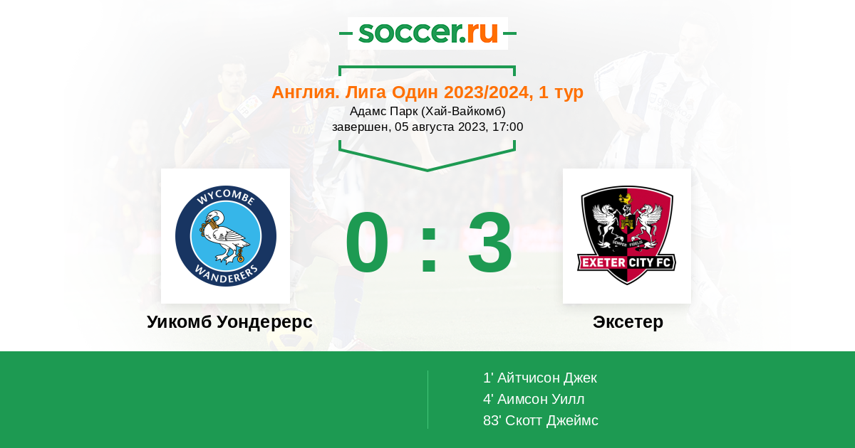 Англия. Первая Футбольная Лига 16.08.2022 Эксетер Логотип футбольный клуб Эксетер 3:1 Логотип футбольный клуб Уикомб Уондерерс (Хай-Вайкомб) Уикомб Уондерерс