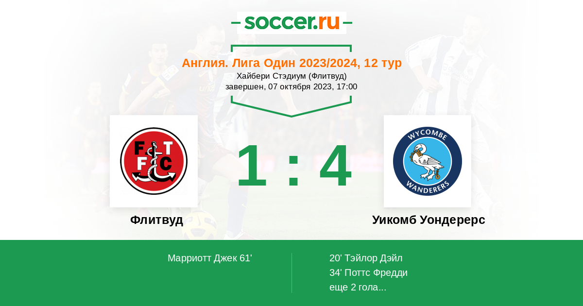Англия. Первая Футбольная Лига 03.09.2022 Флитвуд Логотип футбольный клуб Флитвуд 1:1 Логотип футбольный клуб Уикомб Уондерерс (Хай-Вайкомб) Уикомб Уондерерс