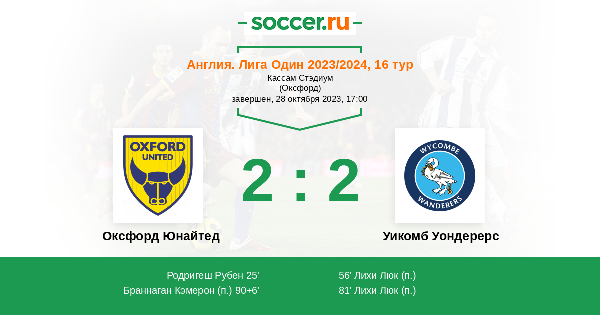 Англия. Вторая Футбольная Лига 01.11.2014 Оксфорд Юнайтед Логотип футбольный клуб Оксфорд Юнайтед 1:2 Логотип футбольный клуб Уикомб Уондерерс (Хай-Вайкомб) Уикомб Уондерерс