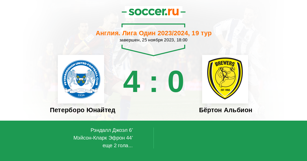 Англия. Первая Футбольная Лига 04.12.2024 Петерборо Юнайтед Логотип футбольный клуб Петерборо Юнайтед 0:1 Логотип футбольный клуб Бёртон Альбион (Бёртон-апон-Трент) Бёртон Альбион