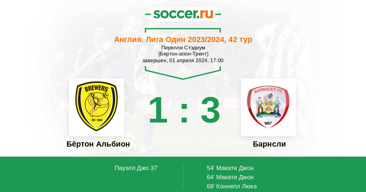 Англия. Первая Футбольная Лига 07.04.2023 Бёртон Альбион Логотип футбольный клуб Бёртон Альбион (Бёртон-апон-Трент) 2:1 Логотип футбольный клуб Барнсли Барнсли