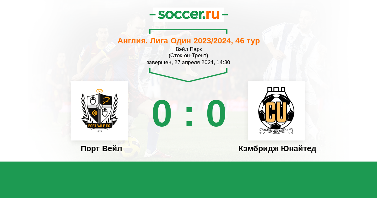 Англия. Первая Футбольная Лига 01.04.2023 Порт Вейл Логотип футбольный клуб Порт Вейл (Сток-он-Трент) 0:2 Логотип футбольный клуб Кэмбридж Юнайтед Кэмбридж Юнайтед
