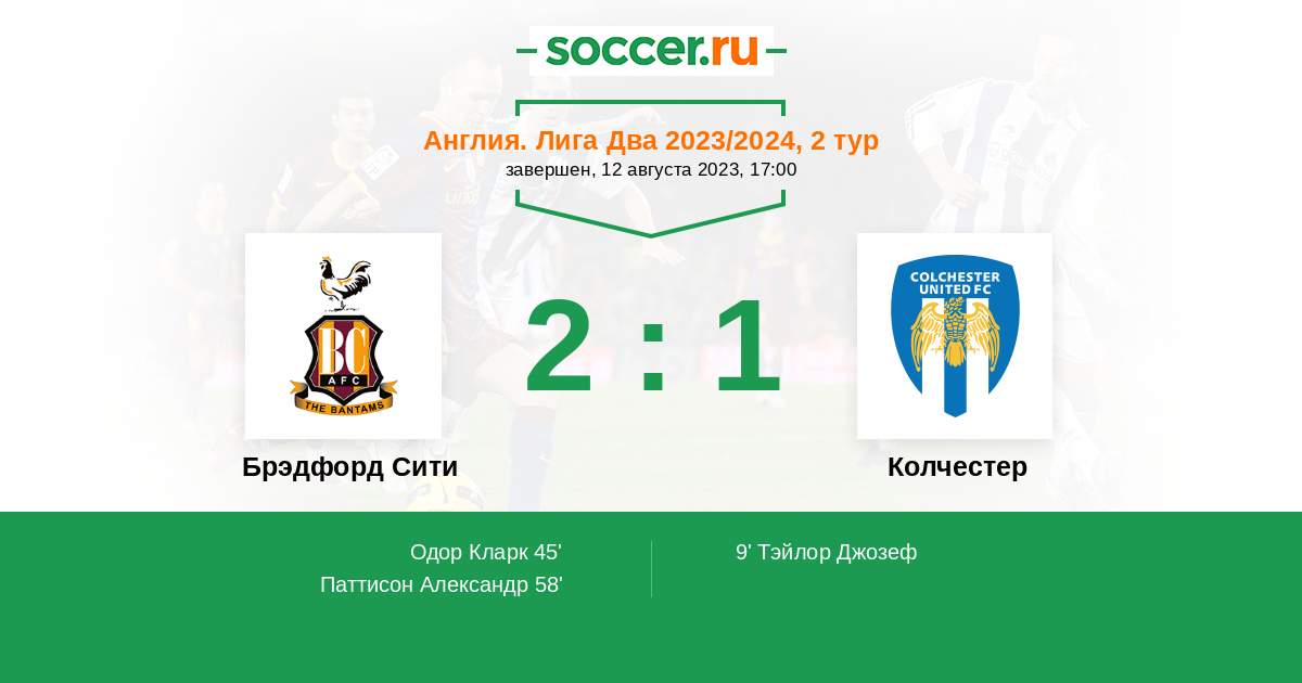 Англия. Вторая Футбольная Лига 16.08.2022 Колчестер Логотип футбольный клуб Колчестер 1:0 Логотип футбольный клуб Брэдфорд Сити Брэдфорд Сити