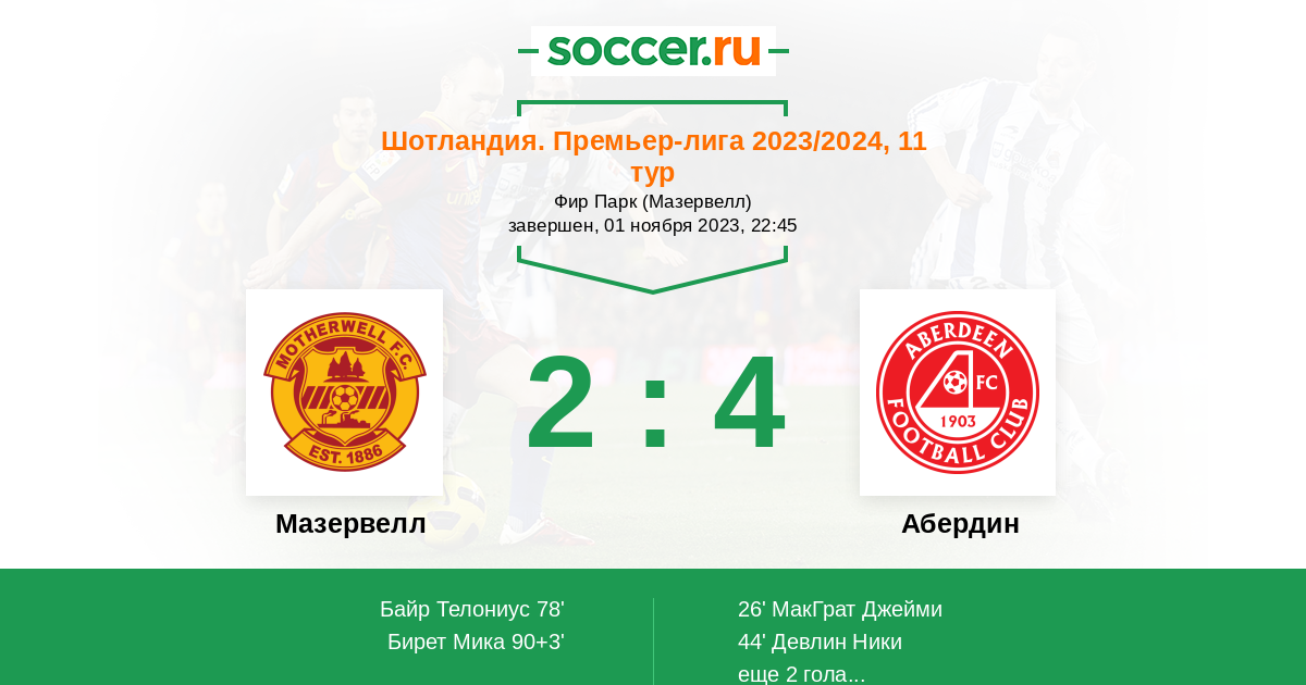Шотландия. Премьер-Лига 06.11.2021 Абердин Логотип футбольный клуб Абердин 0:2 Логотип футбольный клуб Мазервелл Мазервелл