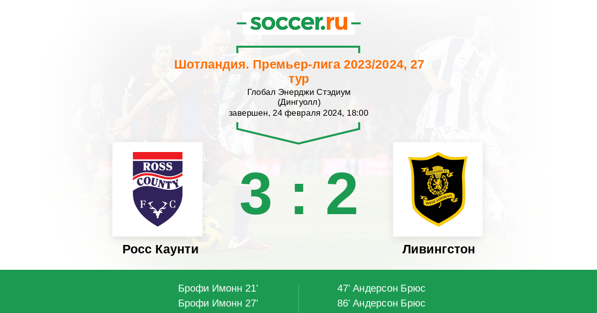 Шотландия. Премьер-Лига 23.10.2021 Росс Каунти Логотип футбольный клуб Росс Каунти (Дингволл) 2:3 Логотип футбольный клуб Ливингстон Ливингстон