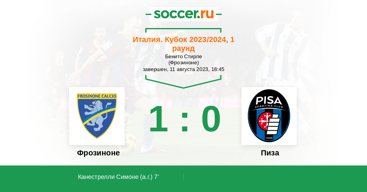 Италия. Кубок 12.08.2024 Фрозиноне Логотип футбольный клуб Фрозиноне 0:3 Логотип футбольный клуб Пиза Пиза