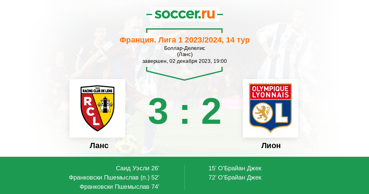 Франция. Лига 1 03.03.2024 Лион Логотип футбольный клуб Лион 0:3 Логотип футбольный клуб Ланс Ланс