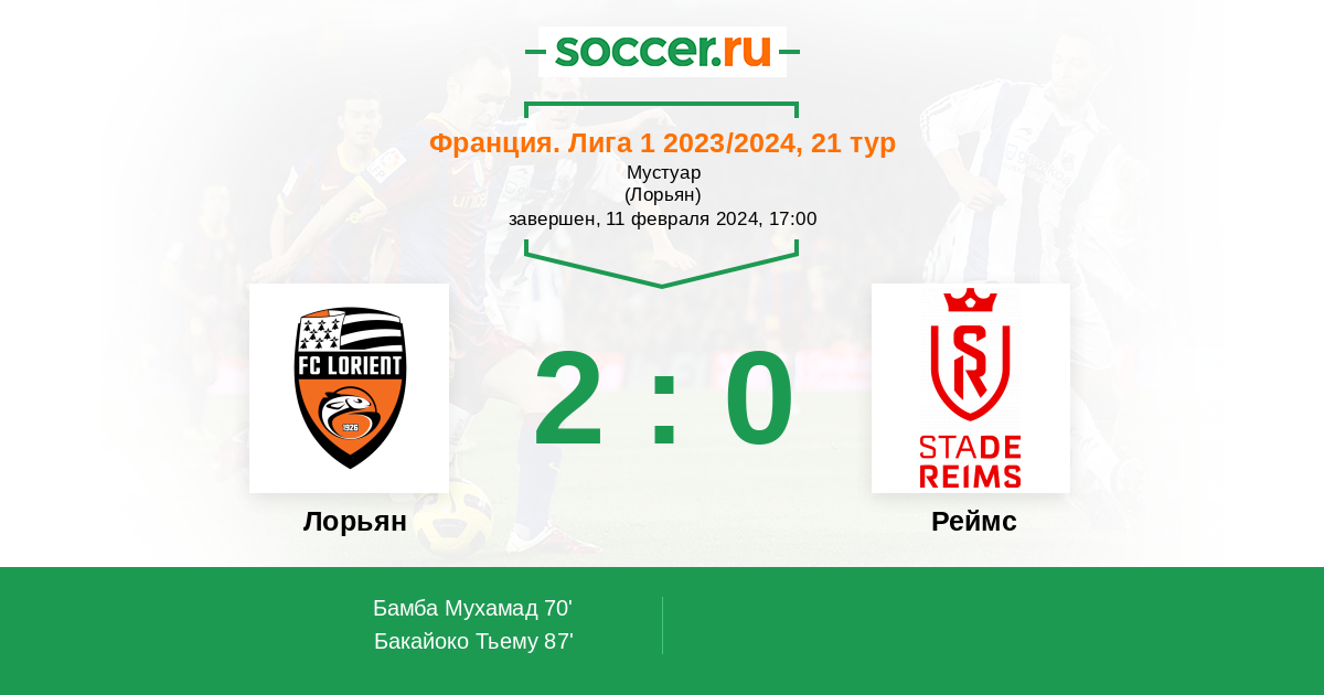 Франция. Лига 1 06.02.2021 Лорьян Логотип футбольный клуб Лорьян 1:0 Логотип футбольный клуб Реймс Реймс