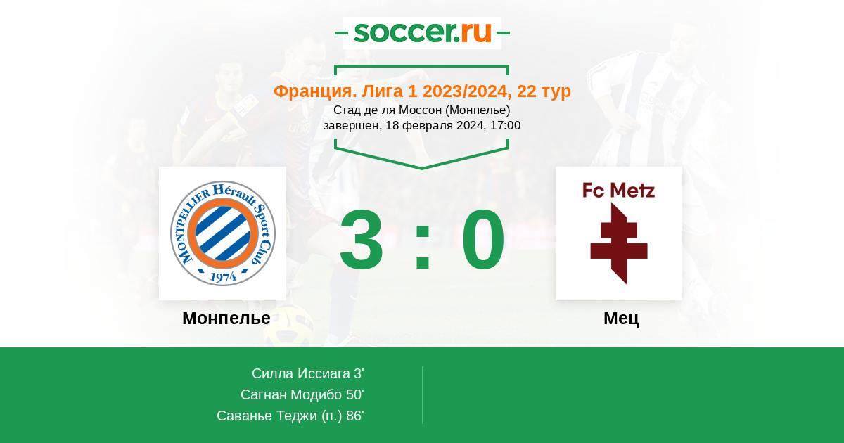 Франция. Лига 1 10.02.2018 Мец Логотип футбольный клуб Мец 0:1 Логотип футбольный клуб Монпелье Монпелье