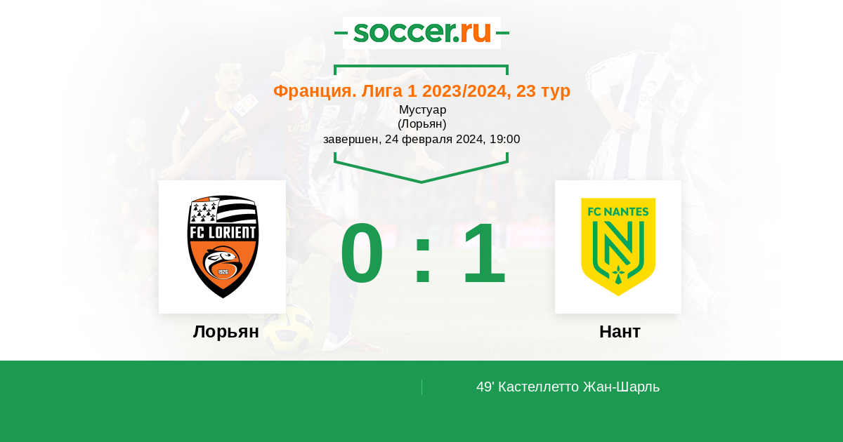 Франция. Лига 1 12.02.2023 Нант Логотип футбольный клуб Нант 1:0 Логотип футбольный клуб Лорьян Лорьян
