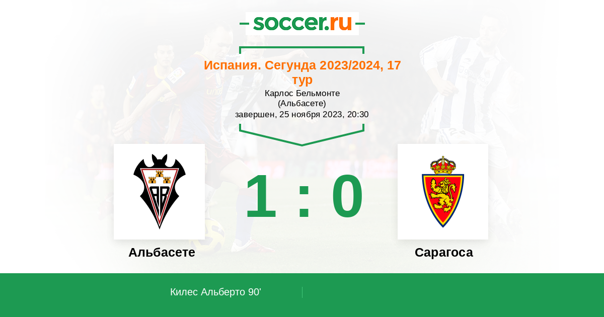 Испания. Сегунда 30.11.2024 Сарагоса Логотип футбольный клуб Сарагоса 0:1 Логотип футбольный клуб Альбасете Альбасете