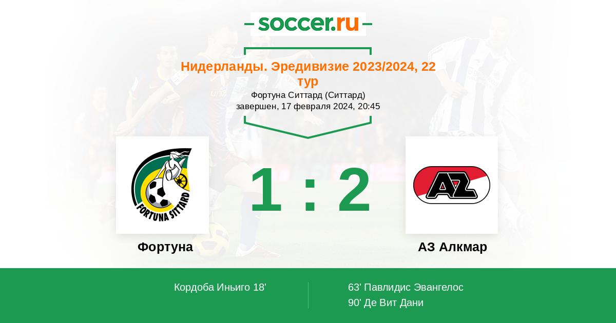 Нидерланды. Эредивизи 23.02.2025 АЗ Алкмар Логотип футбольный клуб АЗ Алкмар 1:0 Логотип футбольный клуб Фортуна (Ситтард) Фортуна