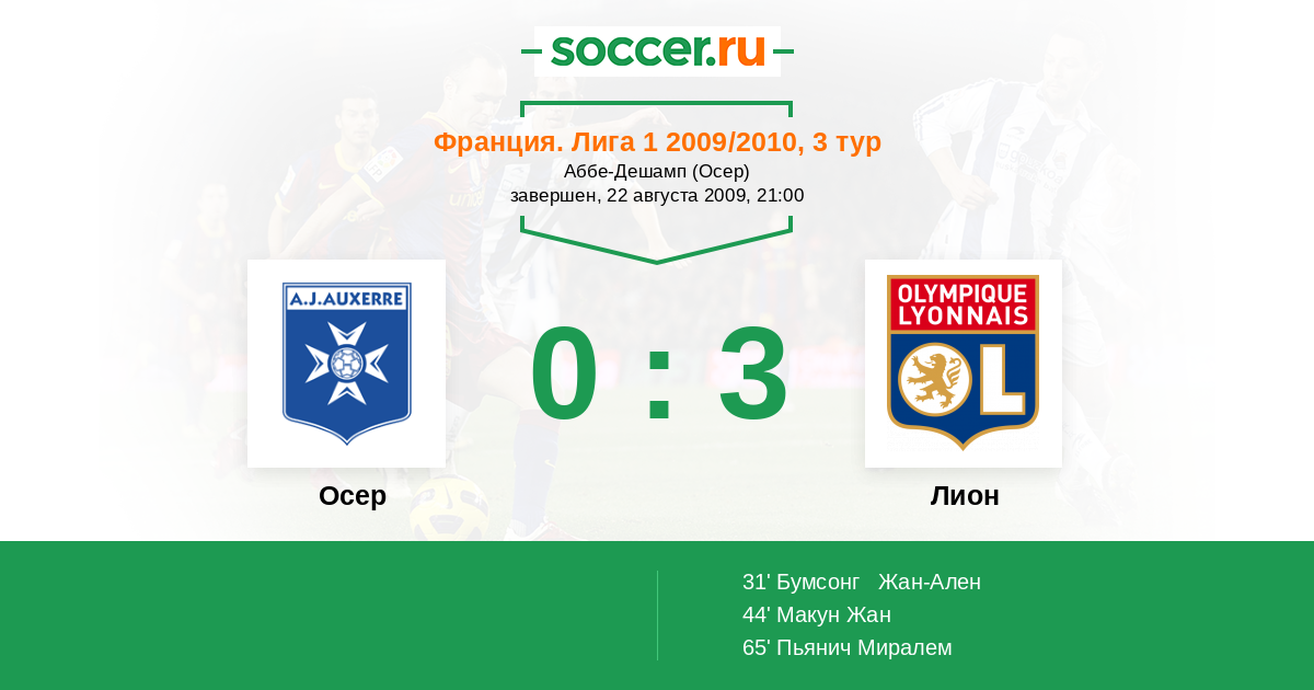 Франция. Лига 1 05.05.2010 Лион Логотип футбольный клуб Лион 2:1 Логотип футбольный клуб Осер Осер