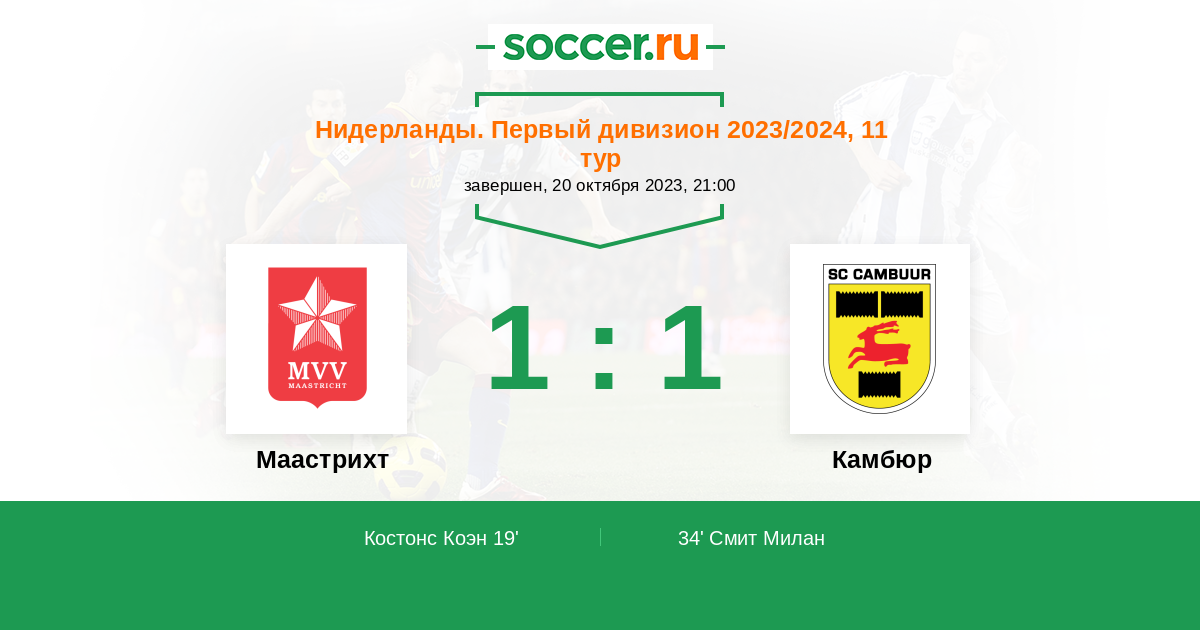 Нидерланды. Первый дивизион 09.08.2024 Маастрихт Логотип футбольный клуб Маастрихт 0:1 Логотип футбольный клуб Камбюр (Лиуварден) Камбюр