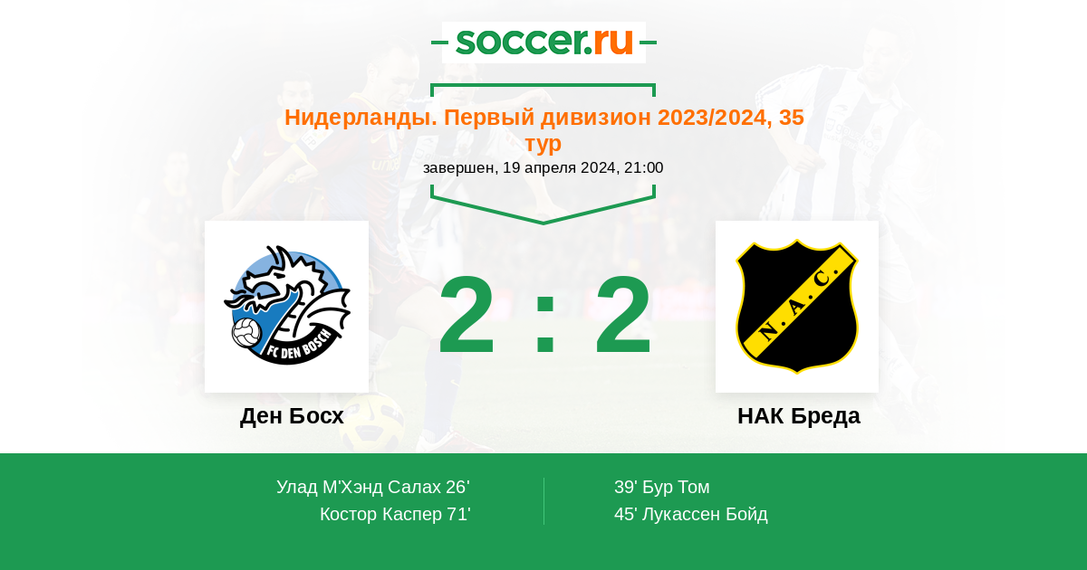 Нидерланды. Первый дивизион 07.04.2023 НАК Бреда Логотип футбольный клуб НАК Бреда 2:0 Логотип футбольный клуб Ден Босх (Хертогенбос) Ден Босх