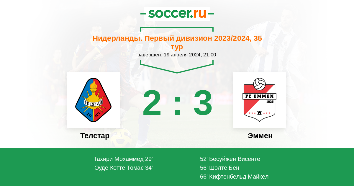 Нидерланды. Первый дивизион 09.04.2012 Эммен Логотип футбольный клуб Эммен 0:2 Логотип футбольный клуб Телстар (Велсен-Зёйд) Телстар