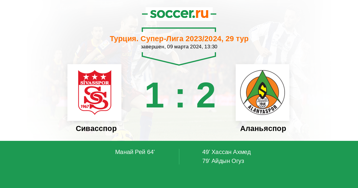 Турция. Суперлига 28.10.2023 Аланьяспор Логотип футбольный клуб Аланьяспор 1:2 Логотип футбольный клуб Сивасспор Сивасспор