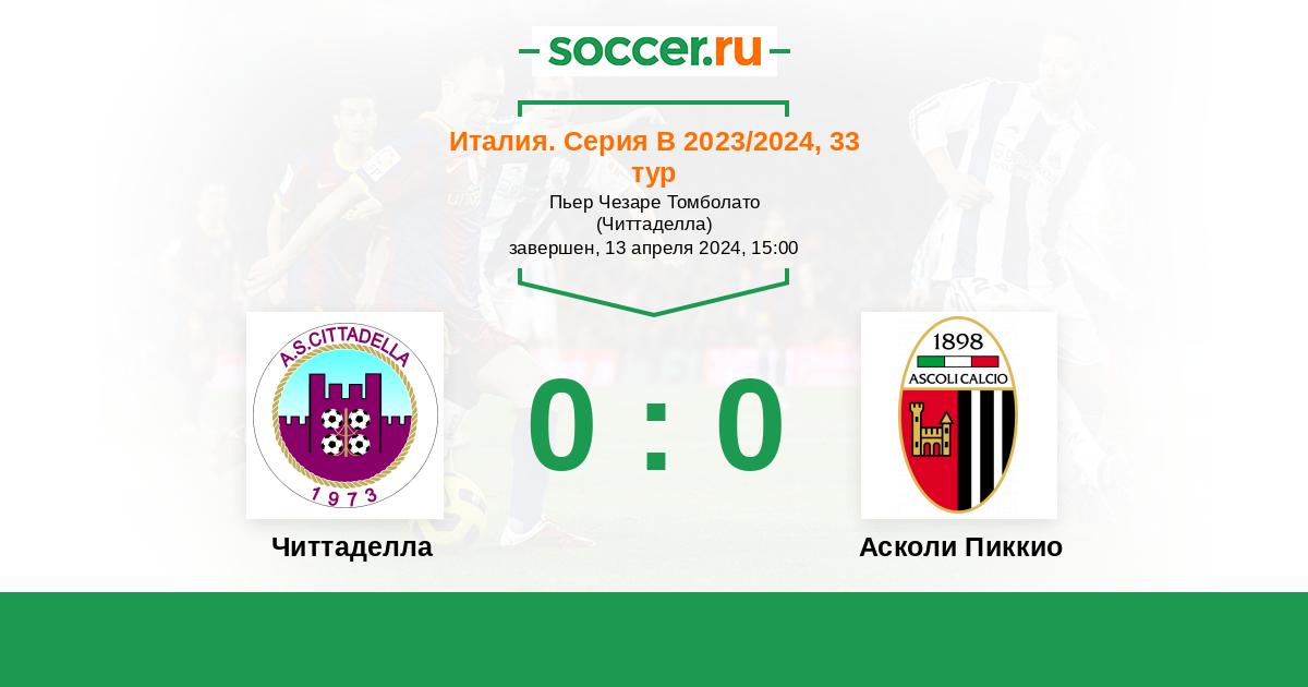 Италия. Серия В 25.04.2022 Асколи Пиккио Логотип футбольный клуб Асколи Пиккио (Асколи-Пичено) 0:0 Логотип футбольный клуб Читтаделла Читтаделла