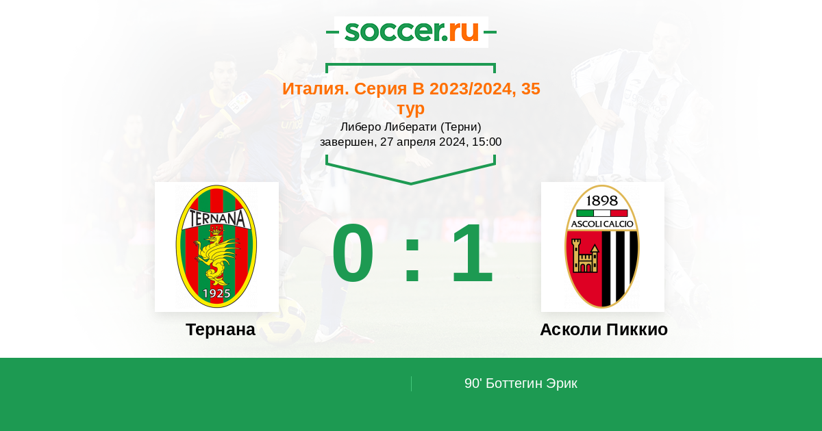 Италия. Серия В 23.04.2016 Тернана Логотип футбольный клуб Тернана (Терни) 1:3 Логотип футбольный клуб Асколи Пиккио (Асколи-Пичено) Асколи Пиккио
