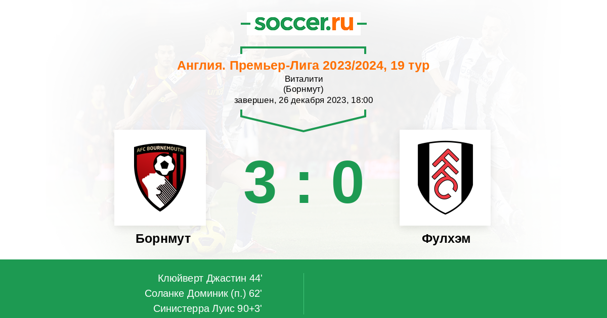Англия. Премьер-Лига 10.02.2024 Фулхэм Логотип футбольный клуб Фулхэм (Лондон) 3:1 Логотип футбольный клуб Борнмут Борнмут