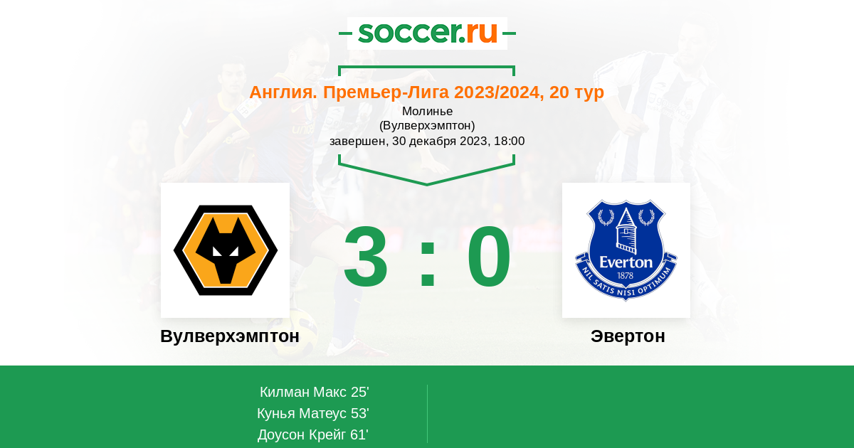 Англия. Премьер-Лига 26.12.2022 Эвертон Логотип футбольный клуб Эвертон (Ливерпуль) 1:2 Логотип футбольный клуб Вулверхэмптон Вулверхэмптон