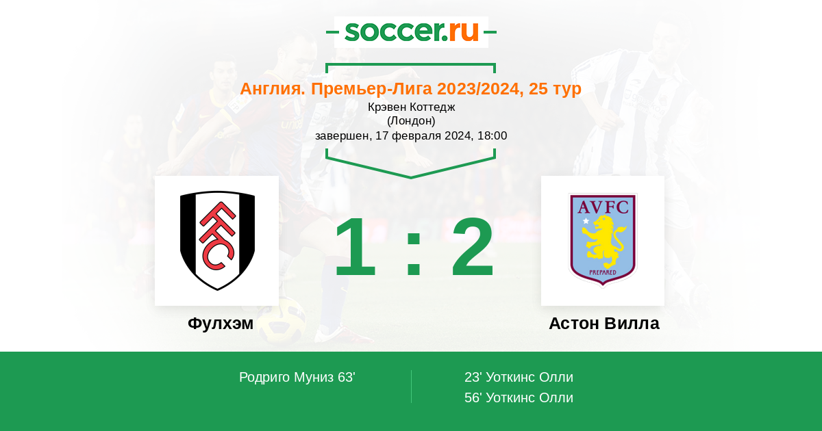 Англия. Премьер-Лига 19.10.2024 Фулхэм Логотип футбольный клуб Фулхэм (Лондон) 1:3 Логотип футбольный клуб Астон Вилла (Бирмингем) Астон Вилла