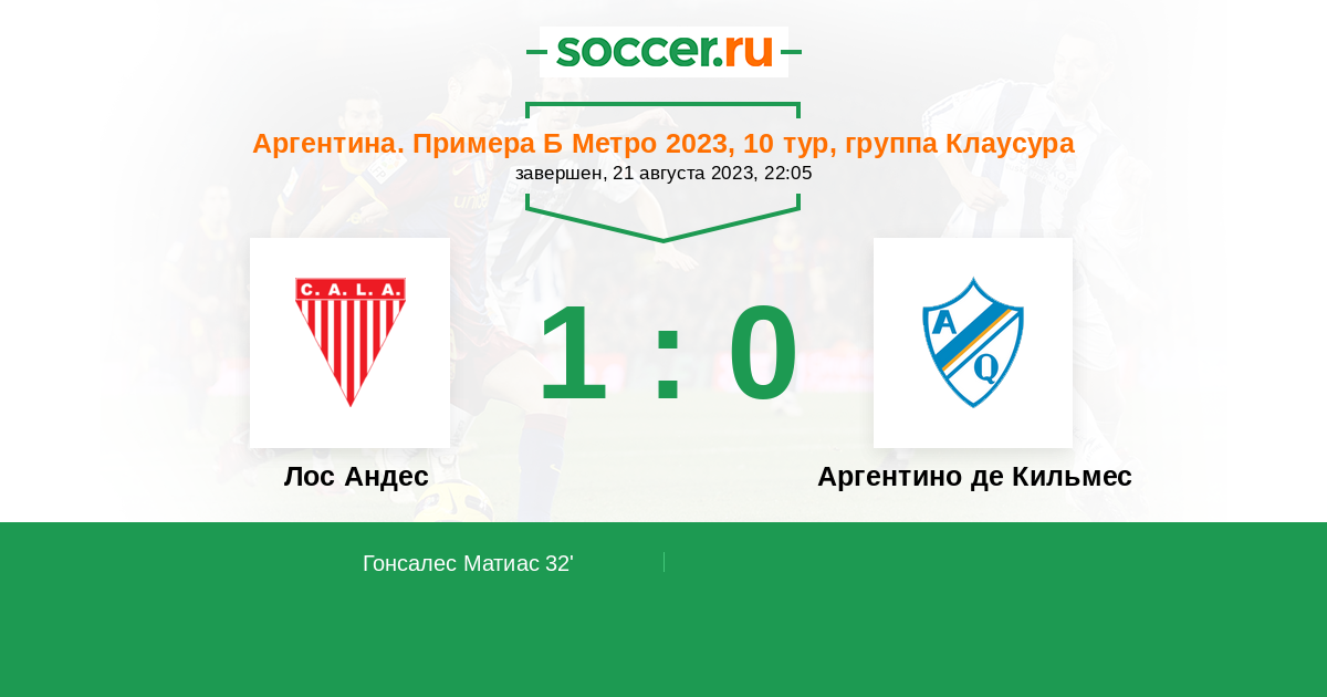 Аргентина. Примера Б Метро 17.04.2023 Аргентино де Кильмес Логотип футбольный клуб Аргентино де Кильмес 1:0 Логотип футбольный клуб Лос Андес (Ломас-де-Самора) Лос Андес