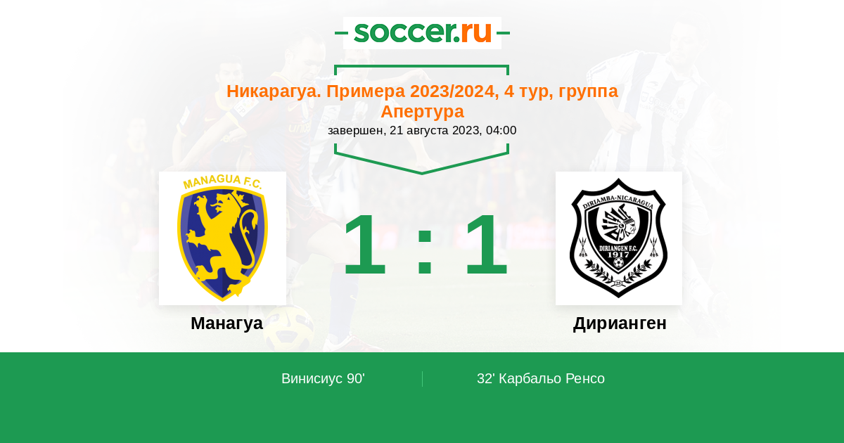 Никарагуа. Примера 11.04.2022 Манагуа Логотип футбольный клуб Манагуа 2:3 Логотип футбольный клуб Дирианген (Дириамба) Дирианген