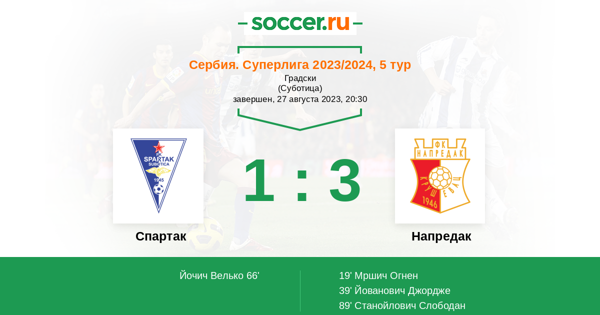 Сербия. Суперлига 17.08.2024 Напредак Логотип футбольный клуб Напредак (Крушевац) 2:0 Логотип футбольный клуб Спартак Суботица Спартак Суботица