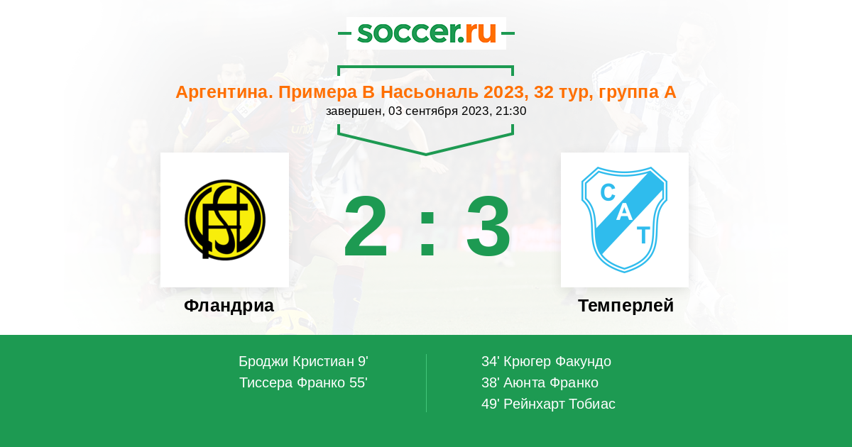 Аргентина. Примера Б Насьональ 25.04.2023 Темперлей Логотип футбольный клуб Темперлей (Тампрелей) 0:2 Логотип футбольный клуб Фландриа (Лухан) Фландриа