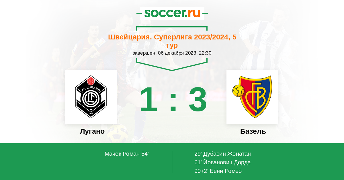 Швейцария. Суперлига 03.02.2024 Базель Логотип футбольный клуб Базель 0:1 Логотип футбольный клуб Лугано Лугано