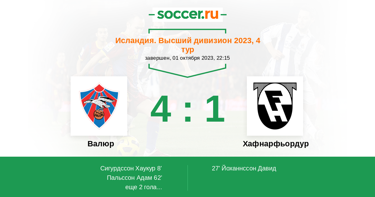Исландия. Высший дивизион 28.09.2014 Валюр Логотип футбольный клуб Валюр (Рейкьявик) 1:4 Логотип футбольный клуб Хафнарфьордур Хафнарфьордур