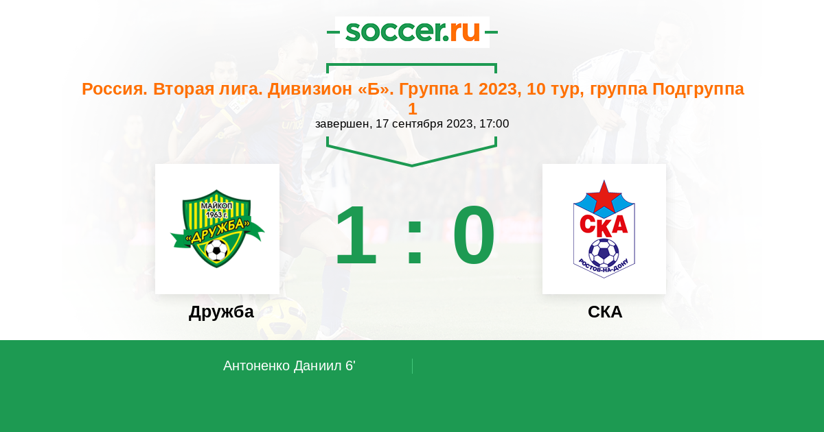 Россия. Вторая лига. Дивизион «Б». Группа 1 06.08.2023 СКА Логотип футбольный клуб СКА (Ростов-на-Дону) 0:1 Логотип футбольный клуб Дружба (Майкоп) Дружба