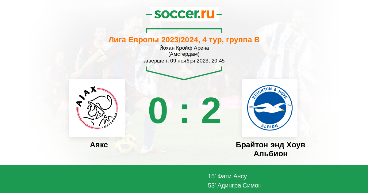 Я думаю что этот матч четвёртого тура Лиги Европы будет одним из самых интересных . На мой субъективный взгляд букмекеры чуть не до оценили команду хозяев поля Аякс , которая потихоньку начинает набирать хороший ход и вполне способна дать бой команде гостей Брайтону и в этом матче жду голов с обеих сторон и ТБ 2.50 .