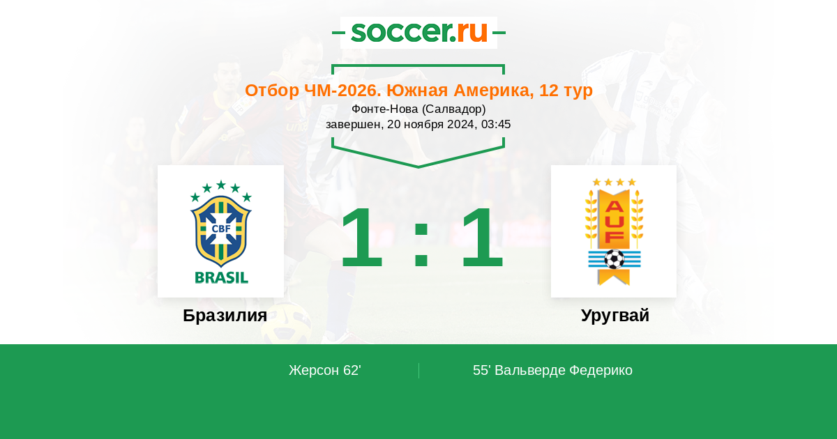 Отбор ЧМ. Южная Америка 18.10.2023 Уругвай Логотип Уругвай 2:0 Логотип Бразилия Бразилия