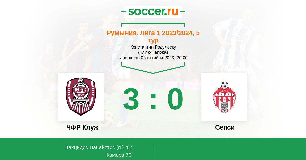 Румыния. Лига 1 25.10.2021 ЧФР Клуж Логотип футбольный клуб ЧФР Клуж (Бухарест) 2:0 Логотип футбольный клуб Сепси (Сфанту Георге) Сепси