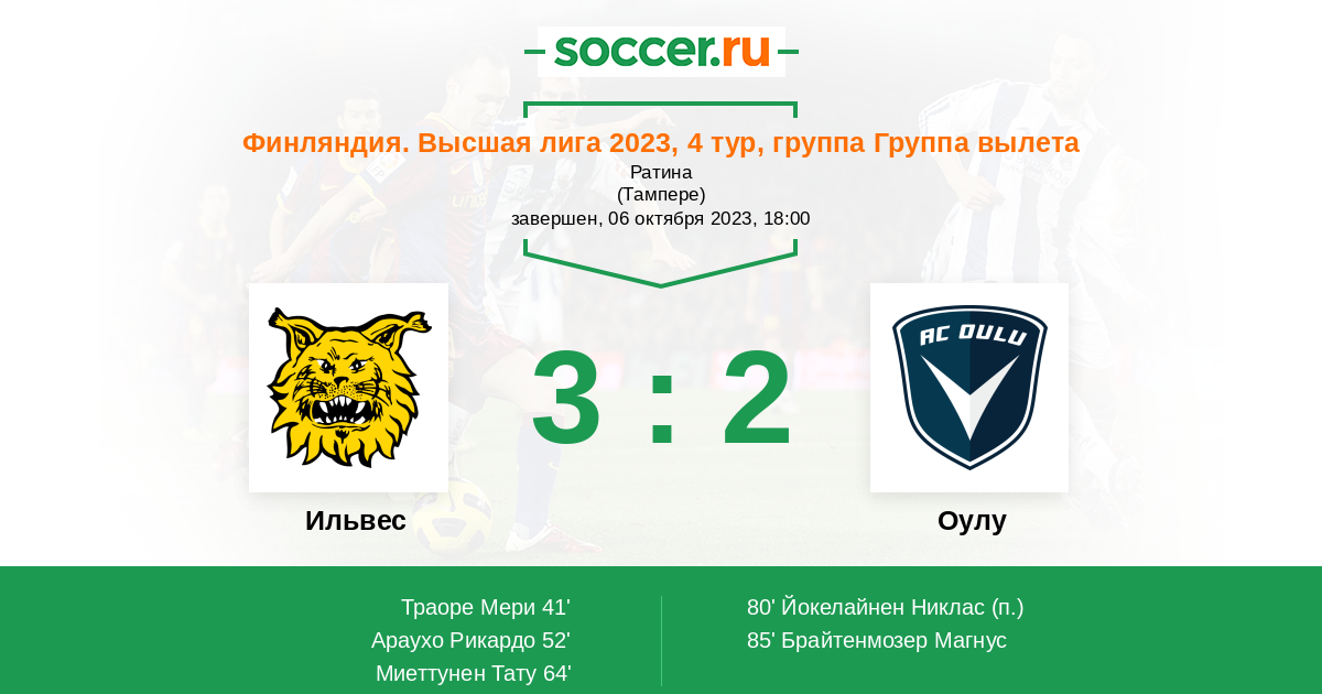 Финляндия. Высшая лига 19.08.2023 Оулу Логотип футбольный клуб Оулу 0:3 Логотип футбольный клуб Ильвес (Тампере) Ильвес