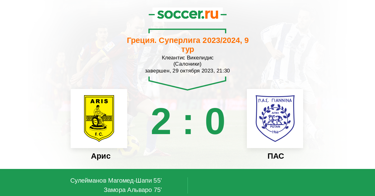 Греция. Суперлига 20.11.2021 Арис Логотип футбольный клуб Арис (Салоники) 0:5 Логотип футбольный клуб ПАС (Яннина) ПАС
