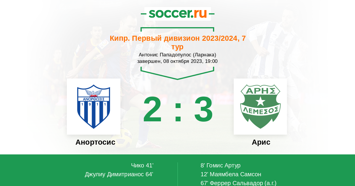 Кипр. Первый Дивизион 07.03.2023 Арис Логотип футбольный клуб Арис (Лимассол) 2:0 Логотип футбольный клуб Анортосис (Ларнака) Анортосис