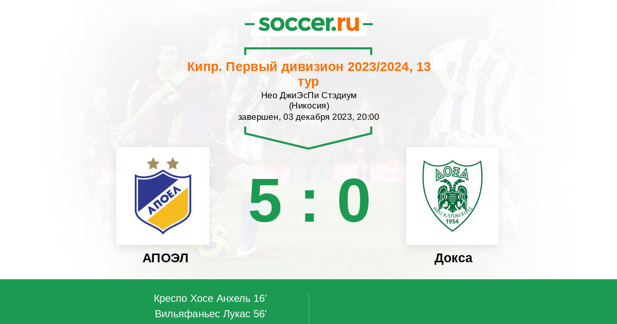 Кипр. Первый Дивизион 14.01.2017 Докса Логотип футбольный клуб Докса (Катокопиас) 0:2 Логотип футбольный клуб АПОЭЛ (Никосия) АПОЭЛ