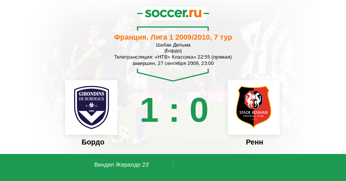 Франция. Лига 1 06.02.2010 Ренн Логотип футбольный клуб Ренн 4:2 Логотип футбольный клуб Бордо Бордо