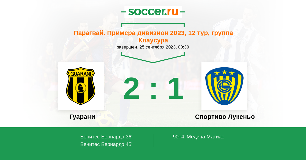Парагвай. Примера дивизион 31.10.2021 Гуарани Логотип футбольный клуб Гуарани (Асунсьон) 2:1 Логотип футбольный клуб Спортиво Лукеньо Спортиво Лукеньо