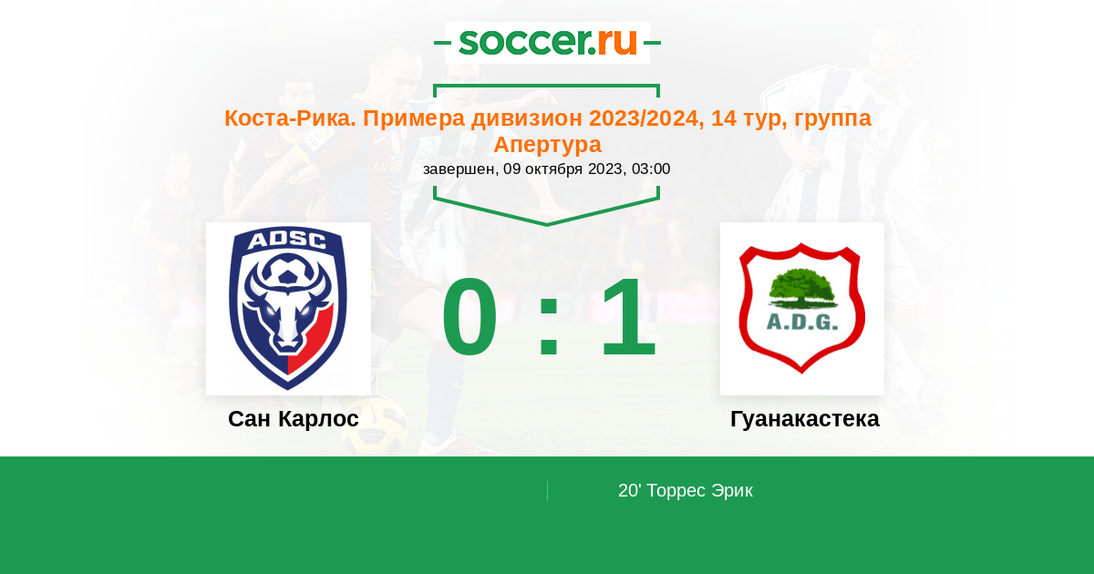 Коста-Рика. Второй дивизион 14.09.2014 Гуанакастека Логотип футбольный клуб Гуанакастека (Никойя) 1:0 Логотип футбольный клуб Сан Карлос (Сьюдад Куэсада) Сан Карлос