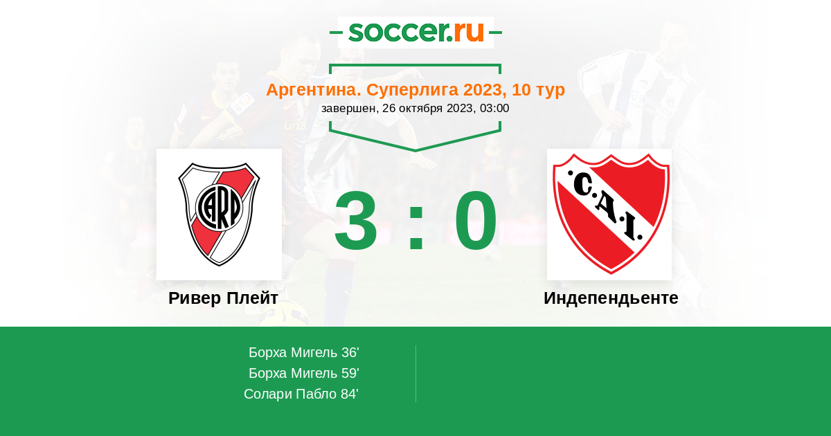 Аргентина. Суперлига 24.04.2023 Ривер Плейт Логотип футбольный клуб Ривер Плейт (Буэнос-Айрес) 2:0 Логотип футбольный клуб Индепендьенте (Авельянеда) Индепендьенте
