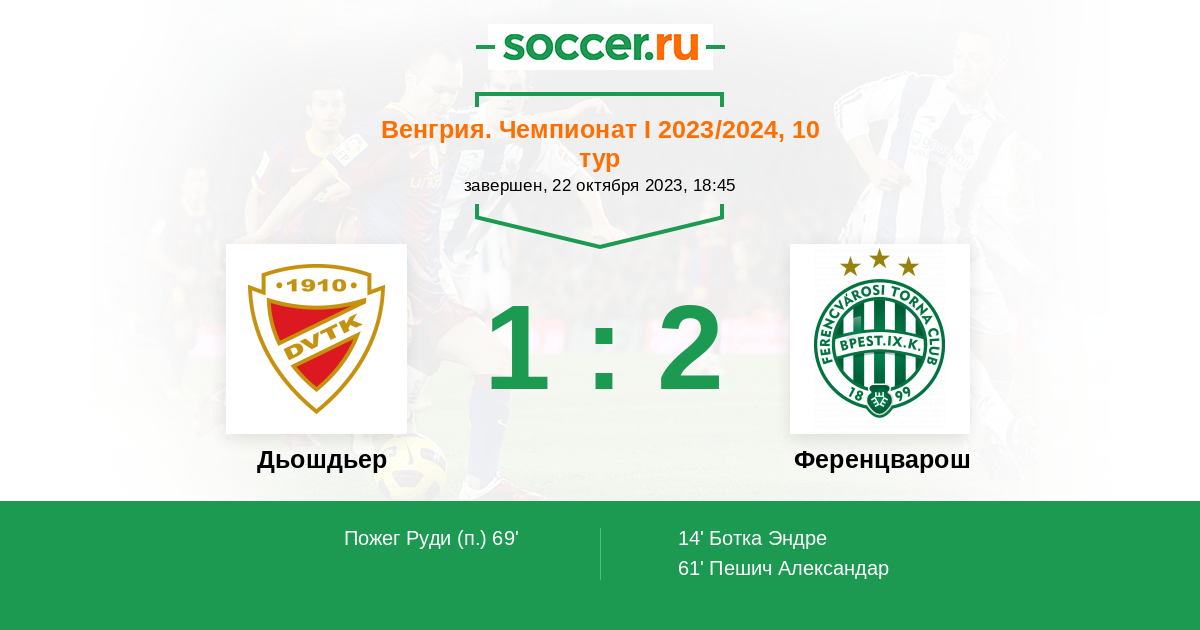 Венгрия. Чемпионат 1 30.09.2012 Ференцварош Логотип футбольный клуб Ференцварош (Будапешт) 2:0 Логотип футбольный клуб Дьошдьер (Мишкольц) Дьошдьер