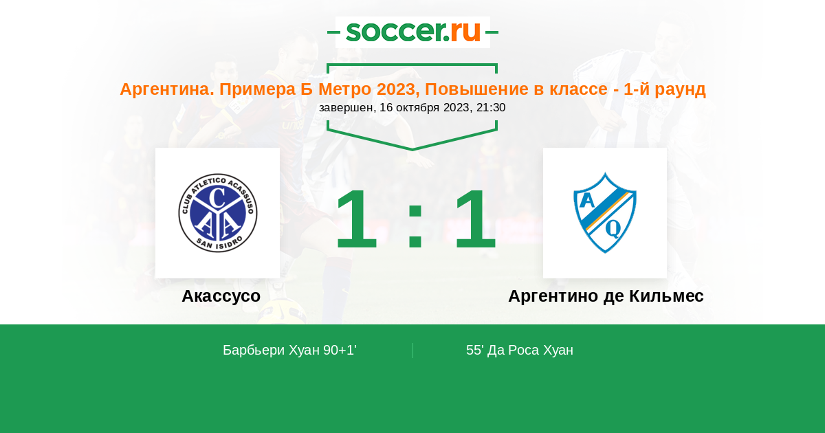 Аргентина. Примера Б Метро 29.10.2023 Аргентино де Кильмес Логотип футбольный клуб Аргентино де Кильмес 1:1 Логотип футбольный клуб Акассусо (Сан-Исидро) Акассусо