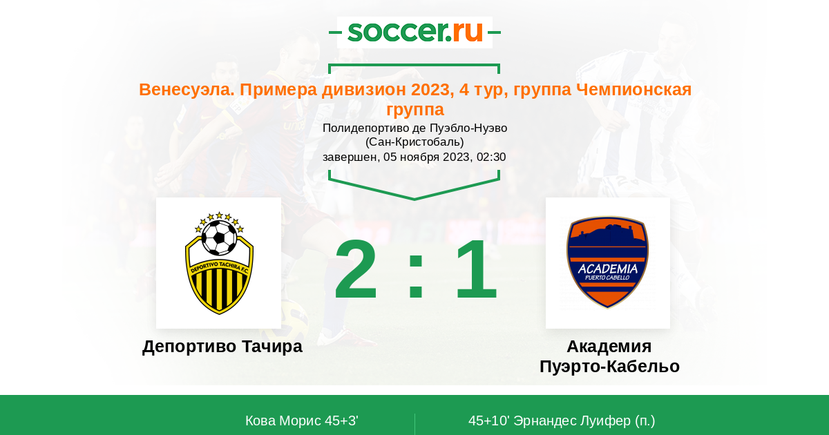 Венесуэла. Примера дивизион 30.10.2023 Пуэрто-Кабельо Логотип футбольный клуб Пуэрто-Кабельо 0:1 Логотип футбольный клуб Депортиво Тачира (Сан-Кристобаль) Депортиво Тачира