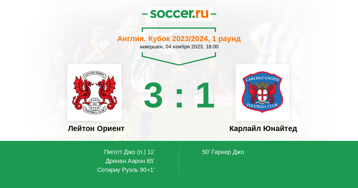 Англия. Первая Футбольная Лига 14.10.2023 Карлайл Юнайтед Логотип футбольный клуб Карлайл Юнайтед (Карлайсл) 0:1 Логотип футбольный клуб Лейтон Ориент Лейтон Ориент